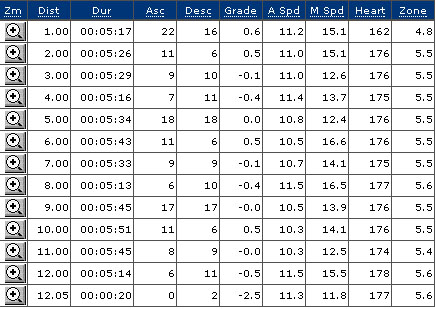 Vakar trasē veicu 12km garu skrējienu, kas man pašreiz ir garākais, ko esmu skrējis. To paveicu 1:06:29, ar vidējo ātrumu 5:30 – drusku ātrāk nekā pēdējā laikā, bet pulss tik un tā turējās vidēji uz 175 bpm. Zemāk ir bilde ar skrējiena analīzi pa kilometriem. Skaitļi runā paši par sevi un rāda, ka visgrūtāk man gājis no devītā līdz vienpadsmitajam kilometram.