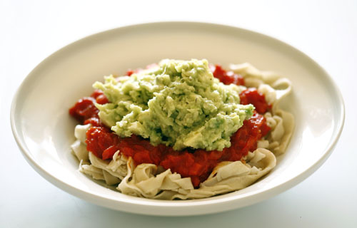 Tad kad makaroni ir gatavi, visticamāk arī tomātu un paprikas maisījums būs okey, tāpēc ņem lielu šķīvi un liec iekšā makaronus, pa virsu klāj sarkano tomātu un paprikas masu, un tam pa virsu zaļo avokado. Visu pārkaisi ar sieru un nākamajā dienā gribēsi gatavot tieši to pašu. Ēdiens ir ar plašām variēšanas iespējām, jo sarkano maisījumu vai taisīt biezāku, ilgāk sautējot, vai šķidrāku, avokado vari likt klāt vairāk citronpiparus, vai maigākā variantā mazāk. Un ar makaroniem arī ir gana plaša iespēja variēt. Avokado nesezonā es šo visu pārtransformēju uz nedaudz citādu ēdienu, kur avokado tiek aizstāts ar sagrieztu ķiploku pielikšanu klāt paprikai un tomātiem. Nav ne vainas.