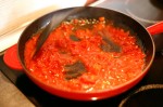 Es sāku ar paprikas sagriešanu sīkos gabaliņos un pannas uzsildīšanu, nedaudz aplietu ar olīveļļu. Paprikas gabaliņu pannā sautē līdz tā saraujas, vai gandrīz sāk jau palikt melna. Drusku apdegs, arī nebūs nekāda vaina. Tad pievieno vienu bundžu konservētos tomātus un nedaudz svaigi maltus piparus. Var izmantot arī veselus konservētus tomātus, bet tie pirms tam ir jāuztaisa par sagrieztiem gabaliņos. To visu dara uz nelielas uguns un pieliekot tomātus par to visu var piemirst, tikai pa laikam apmaisot. Šim maisījumam ir jāzaudē daudz šķidruma un jāiegūst tāda saturīga masa.