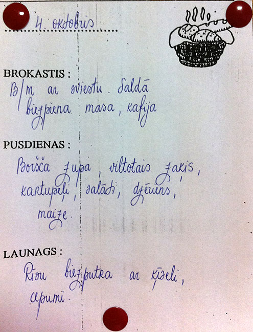 Iespējams bērnudārzs man izraisīja nepatiku pret gaļas zupām. Mums bija tāda audzināšana. Negribi gulēt kārtīgi pusdienas laiku – launagā būs pārpalikušais speķis no zupas. Diemžēl tagad tās ir arī manas vienīgās atmiņas no bērnudārza laika. Mūsdienās ir savādāk, jo mani bērni pēc bērnudārza uz vakariņām skatās reti – esot taču kārtīgu ēdienu pa dienu paēduši. Biešu zupa, kotlete ar griķiem, kartupeļi ar gaļas mērci, putras, pankūkas un dārzeņi. Brokastis, pusdienas un launags.