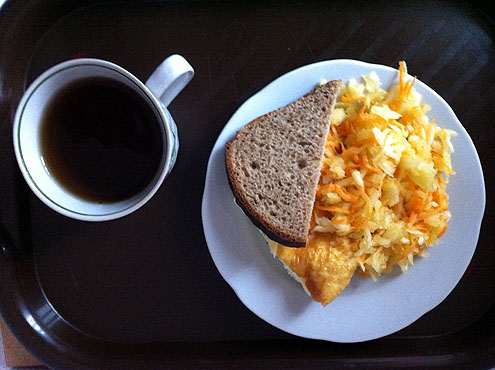 es biju Stradiņos un arī nofotografēju ēdienu :D Pirmajā dienā man atnesa putru sviesta peldē+ krējums. Skatos krējumā kotlete(???), nē- kanēļa bulciņa :D Bet neskatoties uz visu, es apēdu visu, jo draaaausmīgi gribējās ēst :D Stradiņos ir lielākas porcijas kā RDZN :D