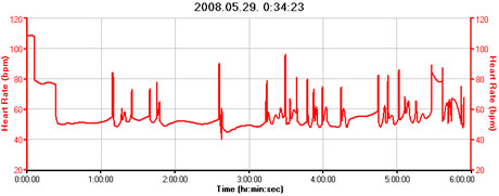 Drusku palasot par pulsu, konstatēju ka tas ir viens no četriem cilvēkam svarīgiem dzīvības parametriem. Pārējie trīs ir ķermeņa tempretūra, asinspiediens un elpošanas biežums. Bet tādos smalkumos neiedziļināšos un labāk pievērsīsimies manām izmērītām nakts gaitām. Iepriekšminētais raksts manai pašapziņai nāca tikai par labu – jo zemāks pulss atpūtas laikā, jo atlētiskāks ir tā īpašnieks. Man šonakt bija vidēji 52 sitieni vienā minūtē. Protams līdz Miguel Indurain līmenim man vēl skriet un skriet, jo viņš esot ar vislēnāko sasniegto pulsu veselīgo cilvēku konkurencē – 28 sitieni minūtē. Viņš arī piecas reizes uzvarējis Tour de France. Man zemākais pēc grafika ir ap 40 sitieniem minūtē.