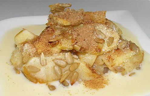 Runā, ka šogad ir slikta ābolu raža, tāpēc tāds rudenīgs ēdiens kā ābolu sacepums, varētu būt īsta delikatese. Blogs „Aijas lietas” sevi pozicionē kā rokdarbu vietni, bet kas gan cits ir ēdienu gatavošana. Ābolu sacepums ar vaniļas mērci nāk no 1987. gadā izdotas grāmatas „Latviešu ēdieni.” Gadījumā, ja šim ēdienam paliek pāri vaniļas mērce, tad to var izmantot citā piedāvātā receptē – biezpiena sacepums ar vaniļas mērci.