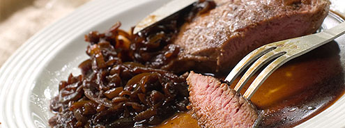 Cūkgaļas karbonādes ar alū karamelizētiem sīpoliem
