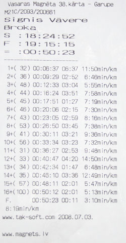 Gāja jau kā parasti, pirmais punkts auzās, pēc tam jau labāk, bet no vienmērīgas skriešanas ne smakas. Kā atrodu punktu, tā brīdi pētu apstākļus nākamā meklēšanā, lai arī zinu ka normāli džeki skrienot uz punktu, jau domā par nākamo. Pie tam novēroju, ka skrienot man grūti padomāt par kaut kādiem tur vēl punktiem. Kā tajā grāmatā Neiburgas Stum Stum, kur varone cērtot malku domā tikai par to fackingo malku un neko citu. Tad vēl divas reizes kļūdījos un nepieciešami veikto 6km vietā es noskrēju vairāk kā septiņus kilometrus. Ar savu sniegumu esmu apmierināts, jo vidējais skriešanas ātrums daudz neatšķīrās no skriešanas ātruma parastā treniņā. Un arī vietu dabūju desmito. Smuki.