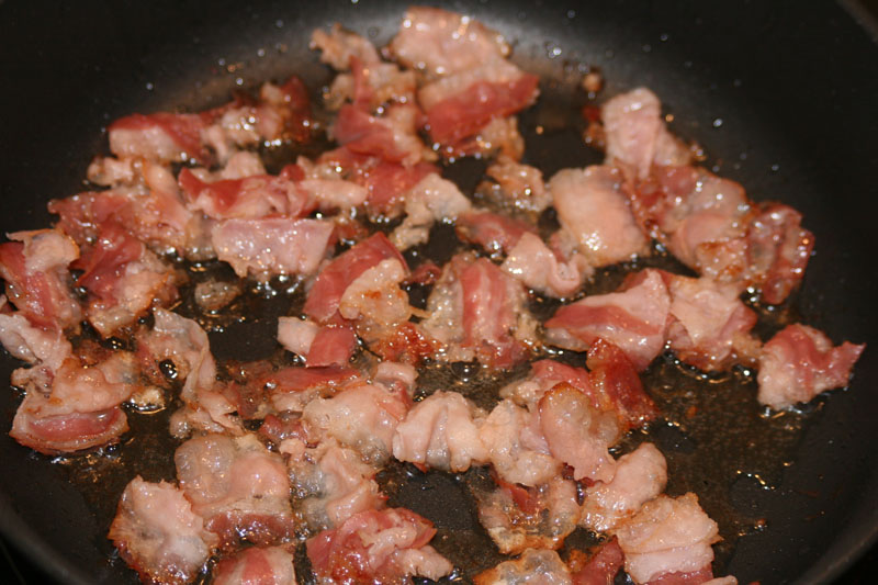 bekons-cepas.jpgTad no vēlreiz no sākuma. Šķiņķi ir jāsagriež nelielos gabaliņos un uz lēnas uguns jāapcep brūns. Pasta jāpagatavo al dente, atkarībā no tā kādu tad pastas paveidu esat izvēlējušies. Vienmēr ir uzjautrinājis tas al dente, jeb kamēr gatavs, bet izrādās ka eksistē vesela lapa ar pamācībām kā ko tādu panākt. No pastas ūdens ir jāsaglabā puse krūzes, ko pievieno olas dzeltenuma un smalki sarīvēta siera maisījumam. Tur klāt vēl pievieno maltus piparus. Matemātika sākas šeit. Kad šķiņķis ir brūns un gatavs, tam nekavējoties pievieno al dente pastu, nogriež karstumu un samaisa ar olas, siera un pastas ūdens maisījumu.