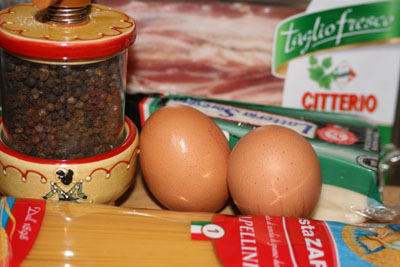 Šķiņķis ir no Itālijas. Guanciale. Bekons, kas pagatavots no cūkas pakrūtes vai dibenpuses gabala, jo tā nosaukums ir atvasināts tieši no tā itāļu vārda, kas apzīmē šo ķermeņa daļu. Es to neatradu, tāpēc savu  pasta alla carbonara gatavoju no pancetta, ka ir līdzīgāks mūsu cauraugušam speķim, bet dažās receptēs tieši šis itāļu gaļas izstrādājums tika minēts kā iespējamais aizstājējs. Pecorino romano ir ciets nogatavināts siers no aitas piena. Es to dabūju, bet var aizstāt ar parmezānam līdzīgu sieru. Bucatini vietā ņemam spageti un viss. Olas, sāls, olīveļļa un nupat malti melnie pipari atradīsies jebkurā virtuvē.