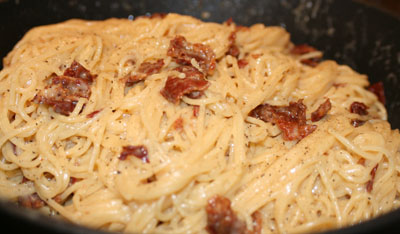Ēdiens ir jau reiz šajā blogā pieminēts. Jā, kā vēsta virsraksts, tas ir pasta alla carbonara, jeb tā pat vienkāršojot – makaroni ar šķiņķi. Protams, dzīve nav vienkārša un kā jau sapratāt, makaroni nav nekādi prastie un arī vajadzīgo šķiņķi nevar tā vienkārši Supernetto nopirkt. Nemaz nerunājot par parmezāna smalko brāli – pecorino romano. Bet Itālijā šo gatavoja ogļrači, tā vienkāršuma dēļ, un Otrā Pasaules kara jenķi aizvedot uz Ameriku šo ēdienu vēl šobaltdien restorānos sauc par ogļraču spageti. Lai arī Latvijā autentisku to visu pagatavot nav nemaz tik krīzei piemēroti, bet es zinu ka vajag. Garšos.