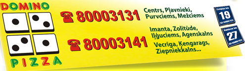 Domino Pizza piedāvā katru desmito picu bezmaksas. Un pašam dodoties savai picai pakaļ vari dabūt 10% atlaidi. Picu izvēle nav ļoti plaša, bet visas klasiskās itāļu picas ir pārstāvētas. Nosauktas gan tās ir pa savam. Bet ņemot vērā ļoti demokrātiskās cenas, to varētu pieciest. Picērija atrodas Zvaigžņu ielā 19 un Kandavas ielā 27. Pasūtīt var pa telefoniem 80003131 un 80003141.
