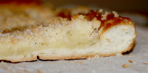 Es arī esmu cepusi laukos plātsmaizes. Man gan labāk garšo ar mazāku mīklas kārtu un vairāk biezpiena. Ābolmaizei pa virsu jau pašā sākumā uzliek skābo krējumu, bagātīgi nober ar cukuru un kanēli, tad veidojas ļoooti garda karamelīga kārta tiem skābajiem āboliem. Mhmmm…