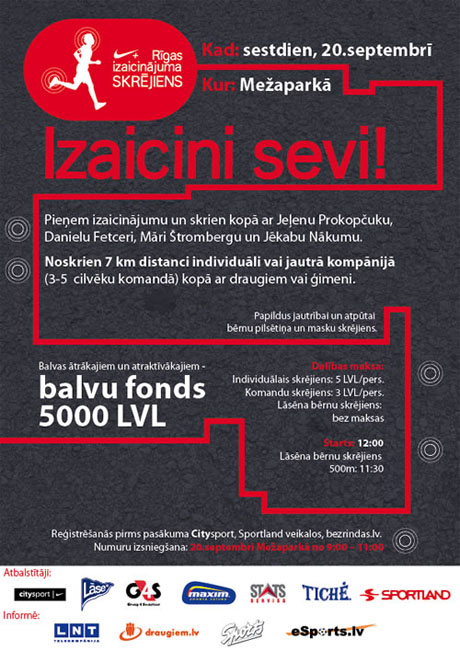 Pieņem izaicinājumu un skrien kopā ar Jeļenu Prokopčuku, Danielu Fetceri, Māri Štrombergu un Jēkabu Nākumu. Noskrien 7km distanci individuāli vai jautrā kompānijā (3-5 cilvēku komandā) kopā ar draugiem vai ģimeni. Papildus jautrībai un atpūtai bērnu pilsētiņa un masku skrējiens. Balvas ātrākajiem un atraktīvākajiem – balvu fonds 5000 LVL.