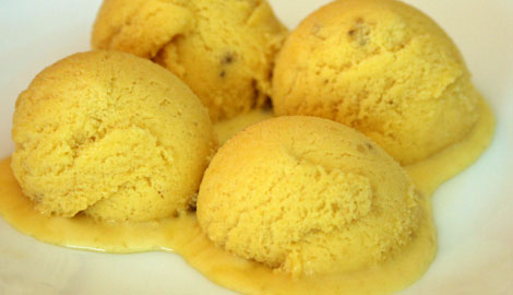 Es savu saldējumu gatavoju no viena iepakojuma saldā krējuma saputotu ar pūdercukuru (cik nu bija), putota olas baltuma ar šķipsniņu sāls, putota olas dzeltenuma un viena banāna. Olas bija četras. Šīs droši vien ir treknais un vienkāršais variants, bet tieši tāds man arī garšo, viegli pakusis, mīksts un salds.