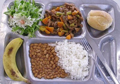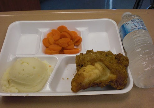Visi, kas grib uzzināt par amerikāņu skolu ēšanas kultūru, var noskatīties Jamie Oliver ēdienu seriālu – Food Revolution. Liela valsts, dažādi paradumi. Šis pusdienu komplekts ir no kādas ASV privātās skolas. Cālis, kartupeļu biezenis, burkāni un ūdens.