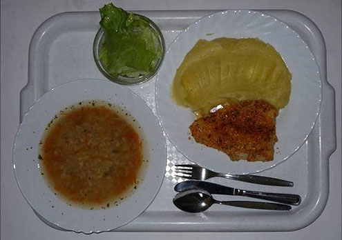 Lai arī Čehijā ir sociālistiska ēdināšanas sistēmas pagātne, pārsvarā visi bērni ēd kompleksās pusdienas un pie tam var digitāli izvēlēties no diviem trim ēdieniem pāris dienas iepriekš. Šoreiz dārzeņu zupa, tomātu biezenis, zivs, dārzeņi un salātlapa.