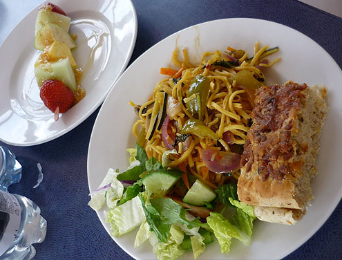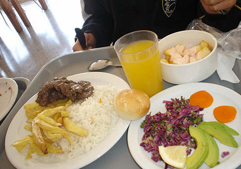 Rīsi, kartupeļi frī, lielops. Kāpostu salāti, avokado, aprikozes un citrona gabaliņš. Apelsīnu sula un jogurts ar augļiem.