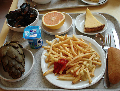 Francijā pret skolas pusdienām izturas ļoti nopietni un bērnu ēdienkartē ir tādi paši ēdieni, kā pusdienojot pieaugušajiem ārpus mājas. Pusdienās vārīts artišoks, mīdijas, kartupeļi frī (french fries), jogurts, greipfrūts, bagete un citronu pīrāgs.