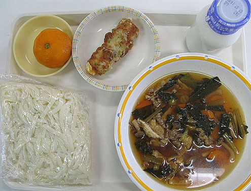 Dažreiz japāņu bērniem tiek piedāvāti arī rietumnieku ēdieni, bet parasti japāņu skolās ēdienkartē dominē rīsi un zivs. Šodien pusdienās Udon nūdeles, zivs desiņa ar sieru, saldēts mandarīns un piens.