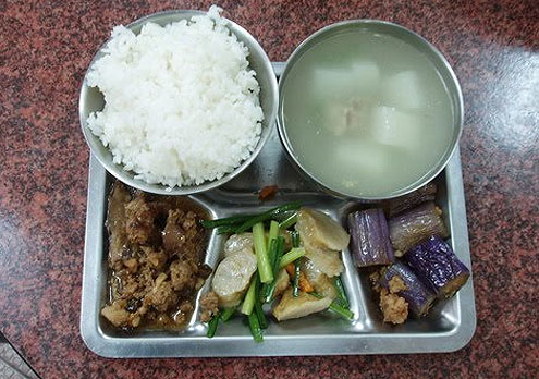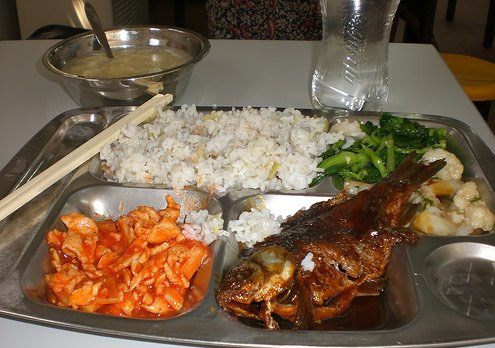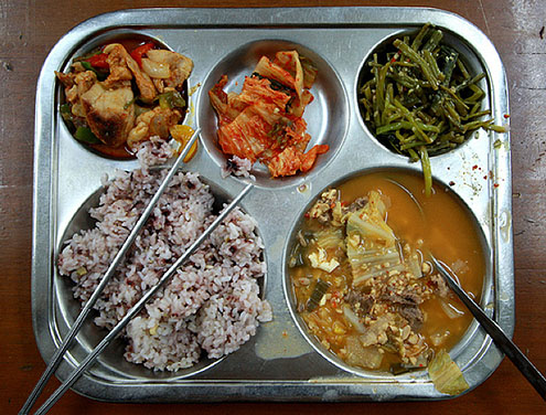 Korejā viss notiek kā armijā. Standartizētas metāla paplātes ar diviem lielajiem traukiem rīsiem un zupai. Savukārt mazie domāti dārzeņiem un zivij. Korejiešu bērni parasti pie pusdienām piedzer saldu jogurtu, kas ir ļoti populārs Korejā. Šajā pusdienu piedāvājumā rīsu un graudu maisījums, pupu sautējums, vista ar dārzeņiem, vārīta jūraszāle un vārītas pākšpupiņas.