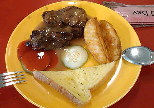 Šeit pusdienas sastāv no rīsiem un piedevām, pie tam ir ieviesta sistēma „ekonomiskie rīsi,” jo rīsi tiek visiem, bet par piedevām ir jāmaksā. Jo vairāk ņem, jo lielāka maksa. Šoreiz gan dārgās pusdienas (pusotrs dolārs) – cālis ar mērci, kartupeļu daiviņas, sviestā cepts ķiploku grauzdiņš, gurķa šķēles un čili mērce.