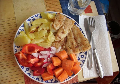 Pusdienās cepta zivs, saldais kartupelis un burkāns, redīsi un sarkanā paprika.