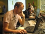 solution-center.jpgSēžu moderni iekārtotā ofisā, kur pie vienas rokas mans paša laptops un pie otras SunRay 170 virtuālā displeja klients, kurā es varu tikt pie sava testa servera, bet vietējie iespraužot viņā kredītkartai līdzīgu ierīci pie visiem saviem datiem un programmām. Pa milzīgu logu redzu vecās rūpnīcas iekštelpas ar neskaitāmiem serveriem, disku masīviem, lenšu arhīviem un medmāsu tērpos tērptiem inženieriem.