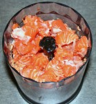 Attīrām lasi no ādas un asakām (nevienu neredzēju). Vienu trešdaļu, sagriežot nelielos gabalos, liekam blenderī un taisām putriņu kopā ar sinepēm. Pārējo lasi, tā pat sagrieztu gabaliņos, ar smalki sagrieztiem sīpoliem, pievienojam un lēnam (ieslēdzot, izlēdzot) blenderējam, bet pārāk neaizraujamies, lai paliek nedaudz nelieli gabaliņi laša.